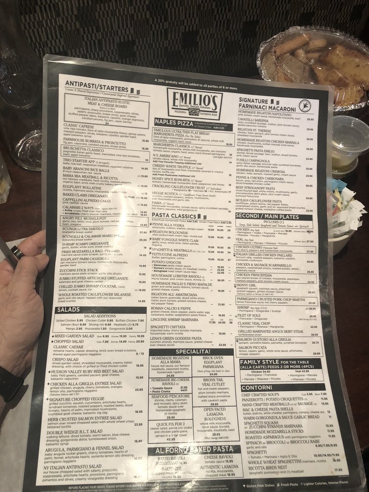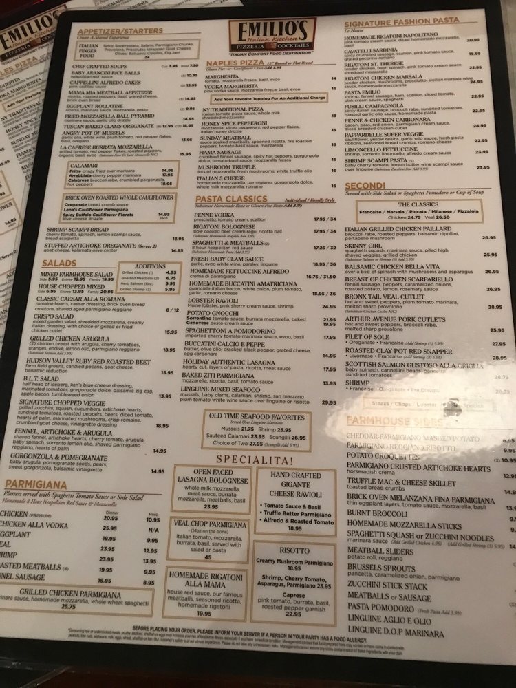 Emilio's Pizzeria & Ristorante in Commack, NY offers a variety of lunch and dinner options in a casual setting. Customer reviews highlight the attentive service and delicious food, with particular praise for the waitstaff. The Naples Pizza selection features traditional favorites like Margherita and Vodkarita, while the appetizers showcase Italian Antipasto and Calamari dishes in various preparations. The ambiance is described as inviting and reminiscent of a classic Italian restaurant. The menu caters to different preferences, with options for groups, children, and those looking for a private dining experience. Overall, Emilio's is recommended for those seeking a cozy and authentic Italian dining experience with flavorful dishes and friendly service.